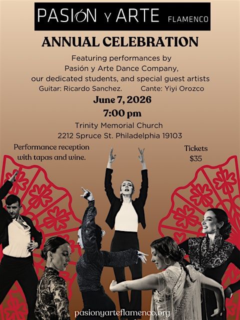 Pasión y Arte Flamenco warmly invites you to our Annual Celebration on June 7, 2026 at Trinity Memorial Church in Philadelphia. This special evening brings together our dance company, dedicated students, and guest artists for a vibrant program of flamenco performance. Featuring guitarist Ricardo Sanchez and cantaora Yiyi Orozco, the celebration highlights the passion, artistry, and community that define flamenco. The program begins at 7:00 PM and will be followed by a reception with tapas and wine where guests can gather, connect, and celebrate together.
