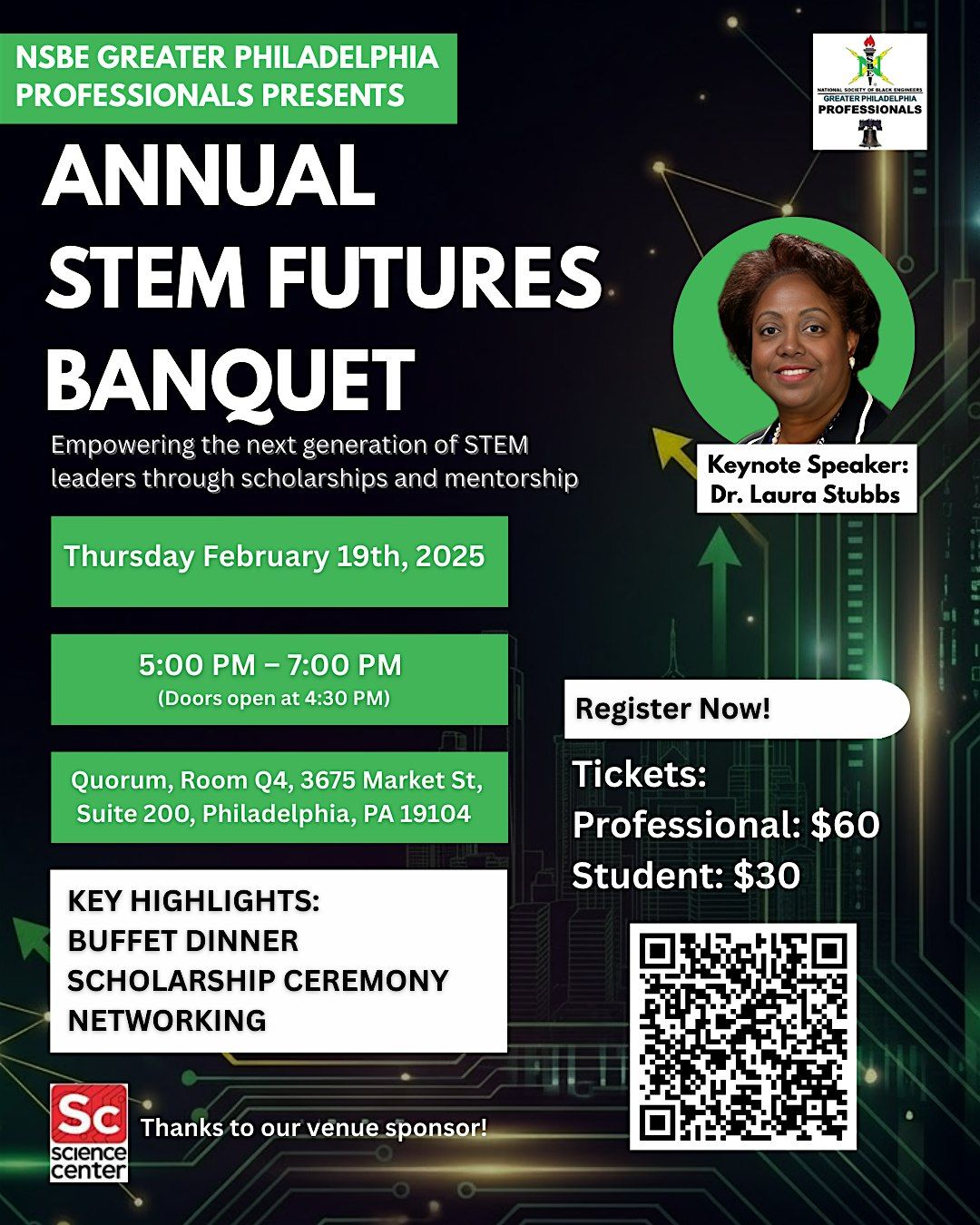 The NSBE Greater Philadelphia Professionals invite you to an evening dedicated to recognizing and supporting the next generation of STEM leaders. The STEM Futures Scholarship Banquet will celebrate outstanding high school seniors who have demonstrated excellence in STEM and award three $1,000 scholarships to help further their education.