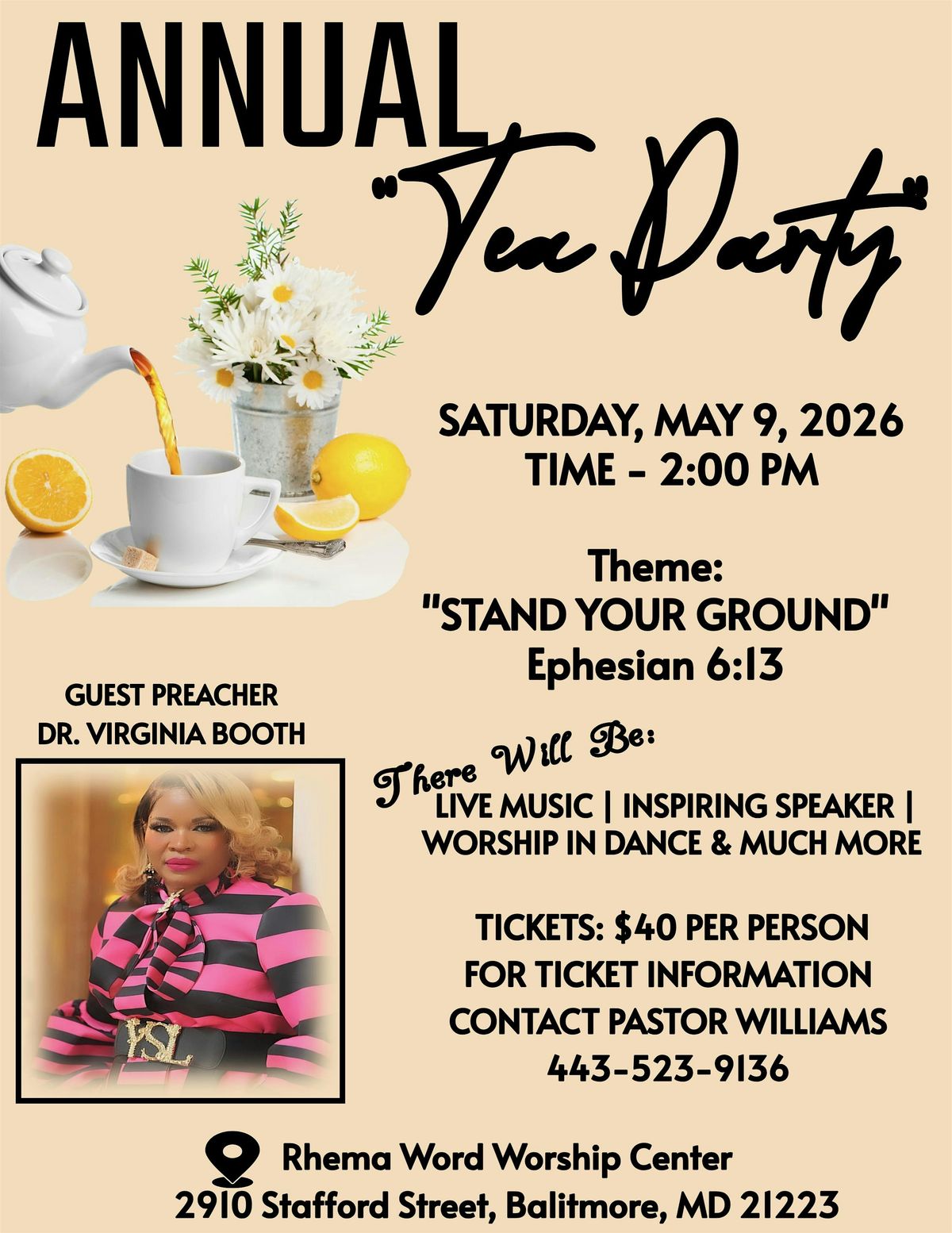 Join us for a powerful and uplifting Faith-Based Annual Tea Party where women of faith will gather in fellowship, encouragement, and spiritual empowerment. This year’s theme, “Stand Your Ground,” reminds us of the importance of remaining steadfast in our faith, standing firm in God’s promises, and being spiritually equipped to face life’s challenges.