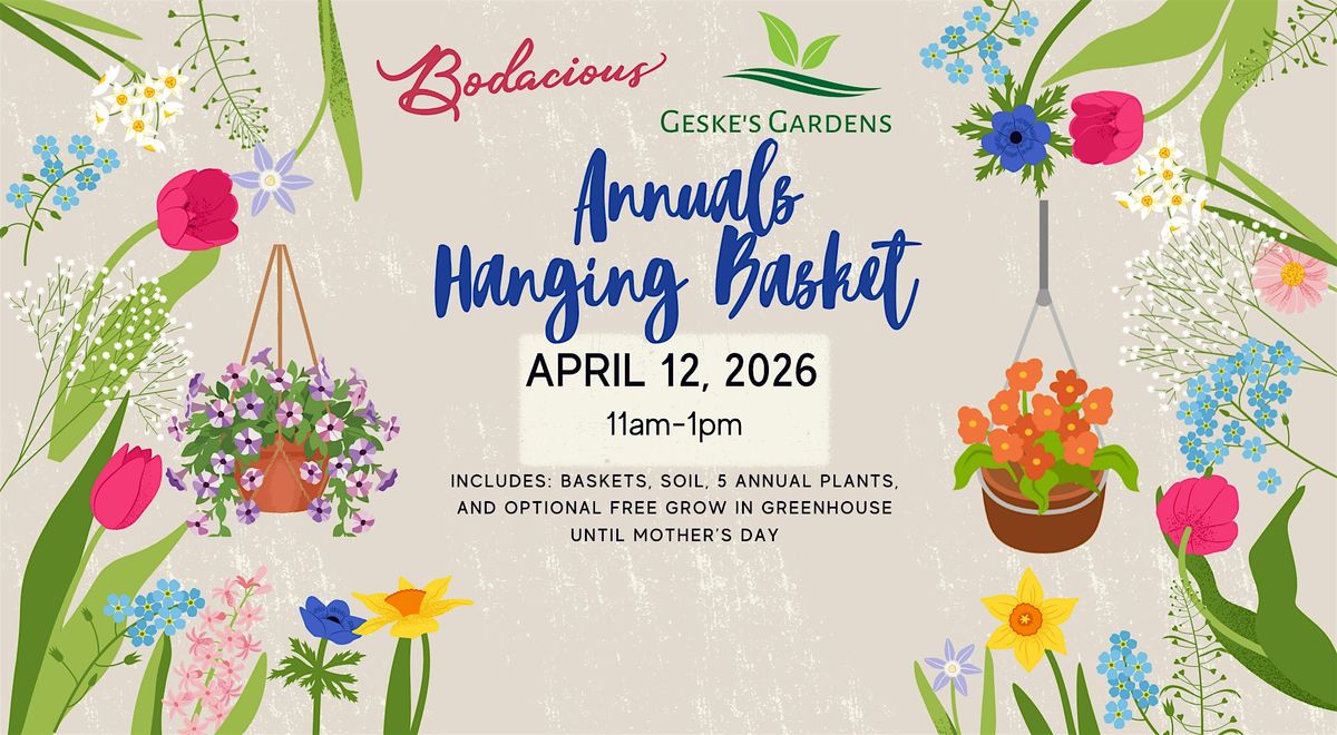 Join us for a hands-on workshop where you'll learn how to design and assemble a beautiful, thriving hanging garden basket that lasts all season long! In this class, we'll cover plant selection, color combinations, soil and fertilizer tips, and proper watering techniques to keep your basket vibrant and lush. Whether you're a beginner or an experienced gardener, you'll walk away with expert knowledge and your very own custom-planted basket to take home. Get ready to add a touch of cascading beauty to your porch, patio, or garden!