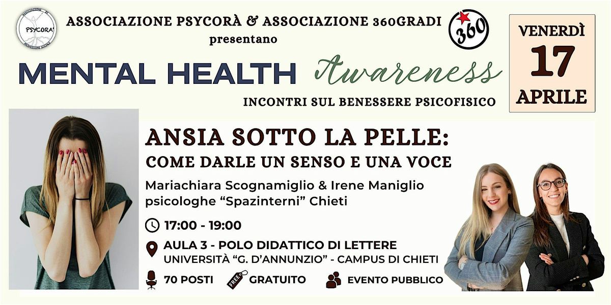 Per questo venerdì 17 aprile, dalle 17:00 alle 19:00, Associazione Psycorà e Associazione 360Gradi ti invitano a un incontro gratuito all'Università "G. D'Annunzio" di Chieti-Pescara: