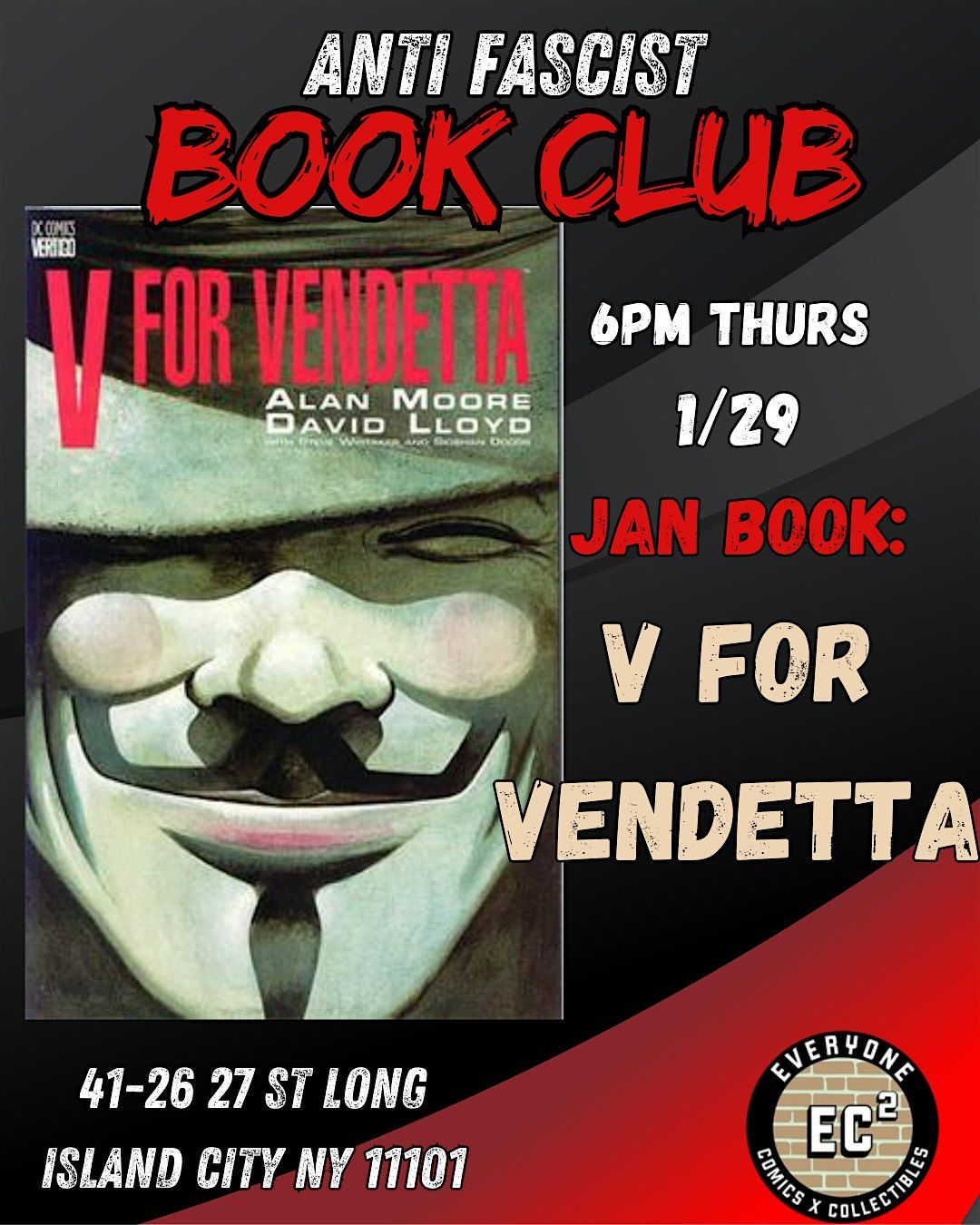 Back by popular demand, Tybalt once again presents V FOR VENDETTA for 2026's inaugural BOOK CLUB. More prescient than ever, this seminal work by Alan Moore asks us who we are in the face of rising (and established) fascism. Come through for a highly informal but informative discussion of the book with fellow comic fans in your community!
