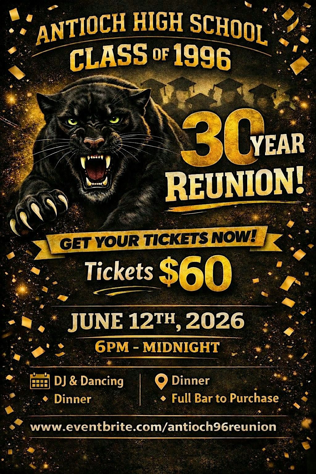 Join us for the Antioch High School Class of 1996 30-Year Reunion!Enjoy an evening of great music, food, dancing, and reconnecting.