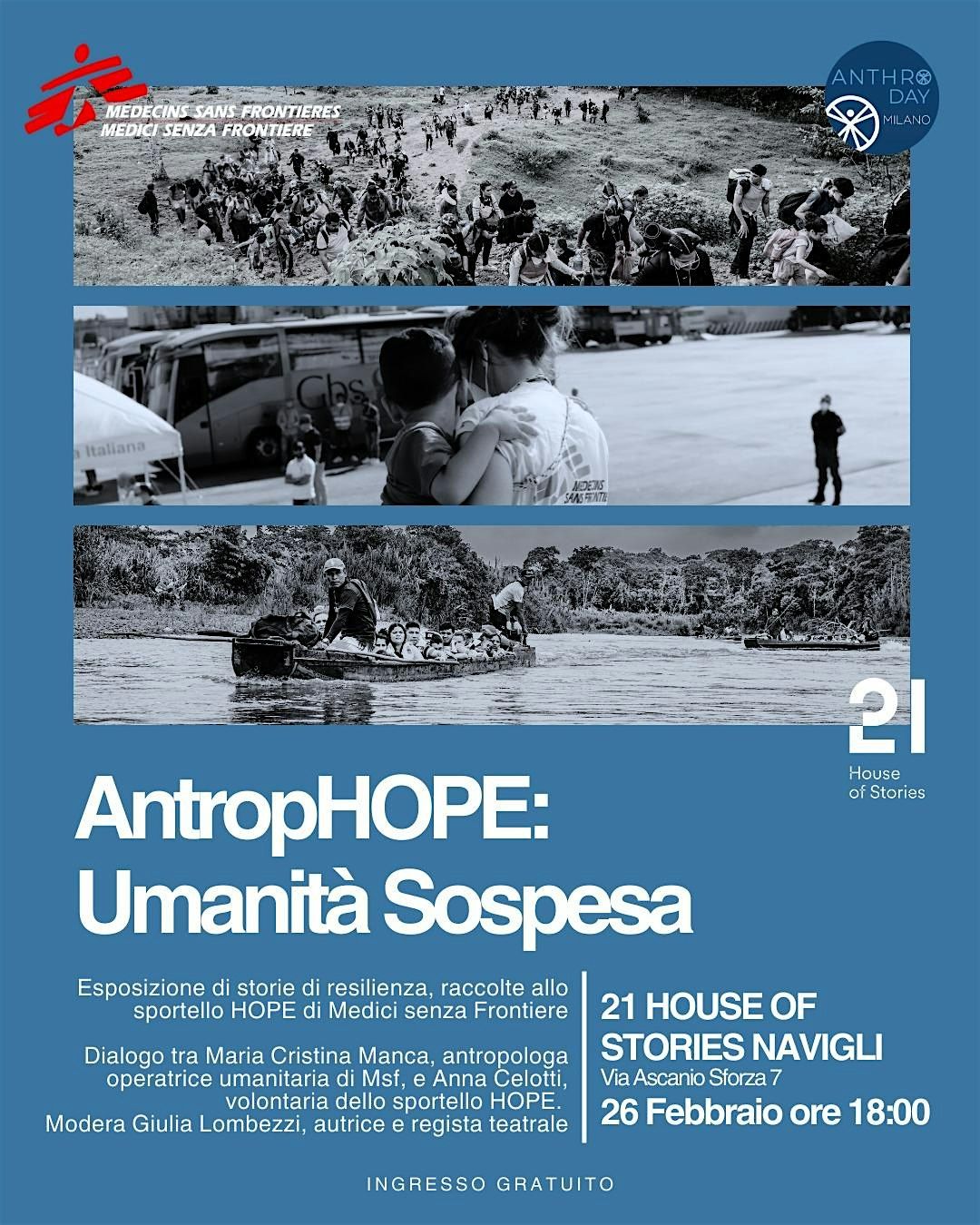 Il gruppo di Milano di Medici senza Frontiere partecipa anche quest'anno al Festival dell'antropologia con una esposizione di storie di resilienza incontrate durante le attività dello sportello HOPE, di MSF, e un dialogo tra Maria Cristina Manca, antropologa e operatrice umanitaria MSF, e Anna Celotti, volontaria dello sportello HOPE, moderate da Giulia Lombezzi, autrice e regista teatrale.