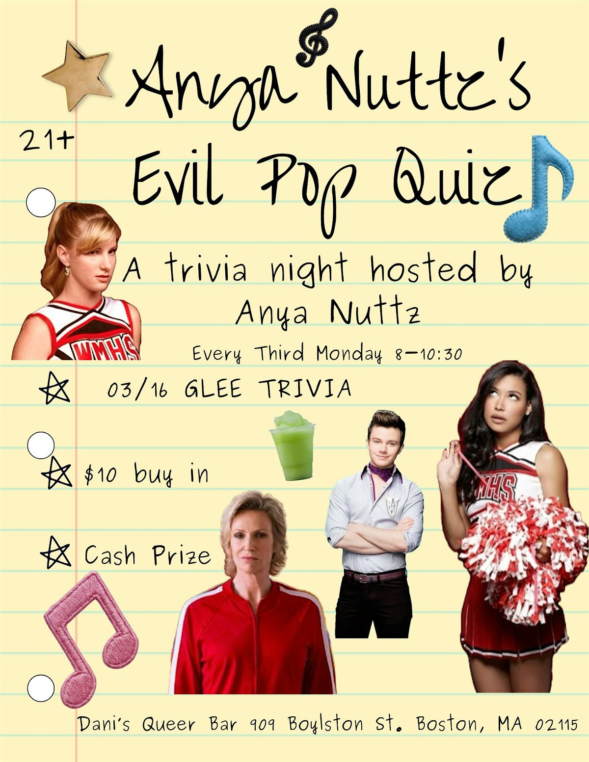 A trivia night hosted by Anya Nuttz with various fun categories, challenging questions, and a cash prize for the winner. $10 buy in at Dani's in person at the event. $5 buy in ahead of time
