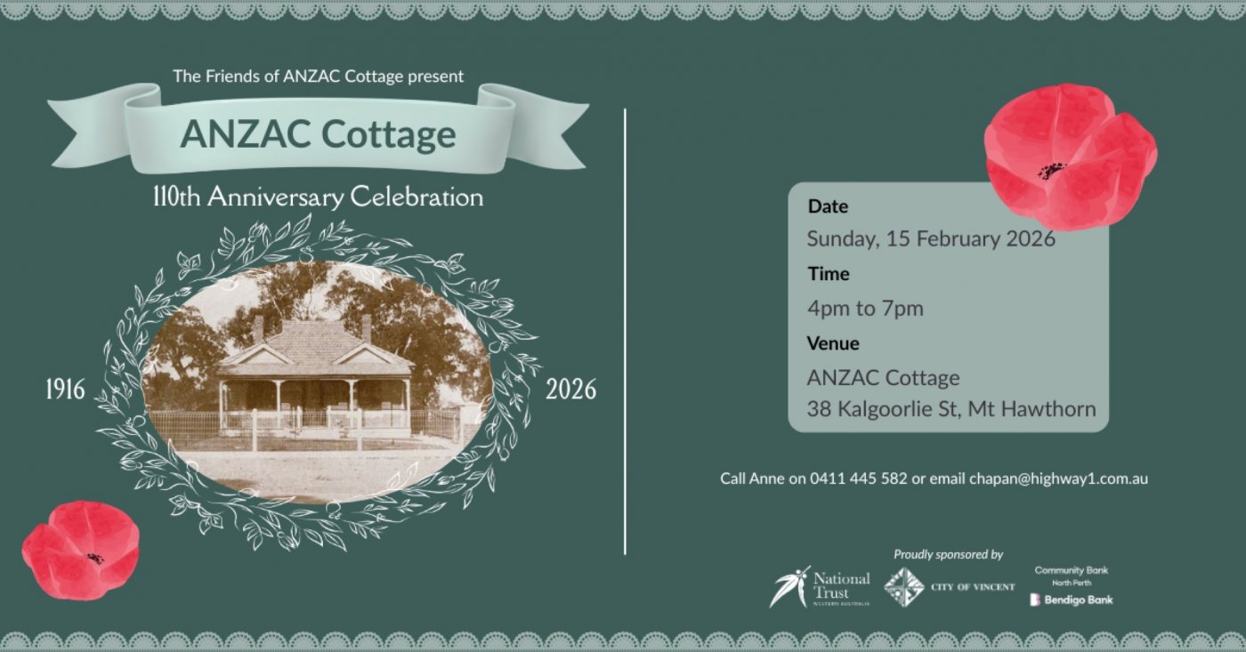 The Friends of ANZAC Cottage is pleased to invite you to their 110th birthday celebration on February 15, 2026, from 4 pm to 7 pm. The Friends have organised the celebrations to reflect, where possible, the day 110 years ago when the Mount Hawthorn community came together to build this historic building, the first World War 1 memorial in Western Australia. Amazing to think a house built in one day still stands 110 years later!
