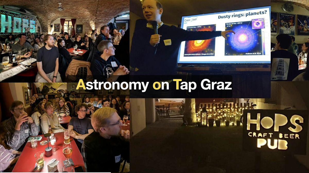 Astronomy on Tap, Graz (AoT Graz) is a series of monthly events, where people interested in Astronomy get together in a bar and listen to nerdy talks over delicious beer. Each event consists of two entertaining talks in English presented by experts in Astronomy. There's also a science-themed quiz and plenty of time in between to chat about space-stuff.