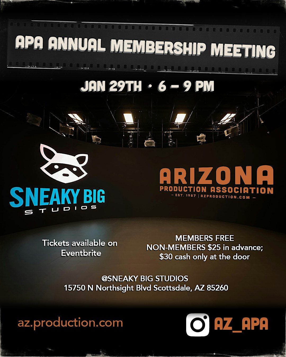 NOTE: Individuals who work for a company that is an APA member or talent who are represented by an agency that is a member are NOT considered APA Members themselves. If you are NOT a member of the Arizona Production Association yourself, please purchase a ticket if you would like to attend this event.