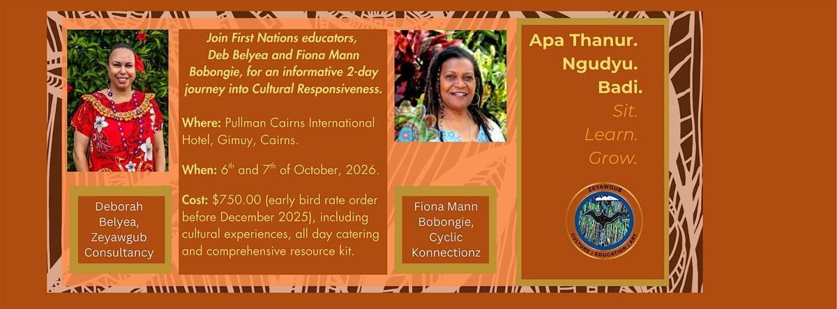 Come and join First Nations educators, Deb Belyea and Fiona Mann Bobongie, for a 2-day workshop into Cultural Responsiveness on Country.About this Event