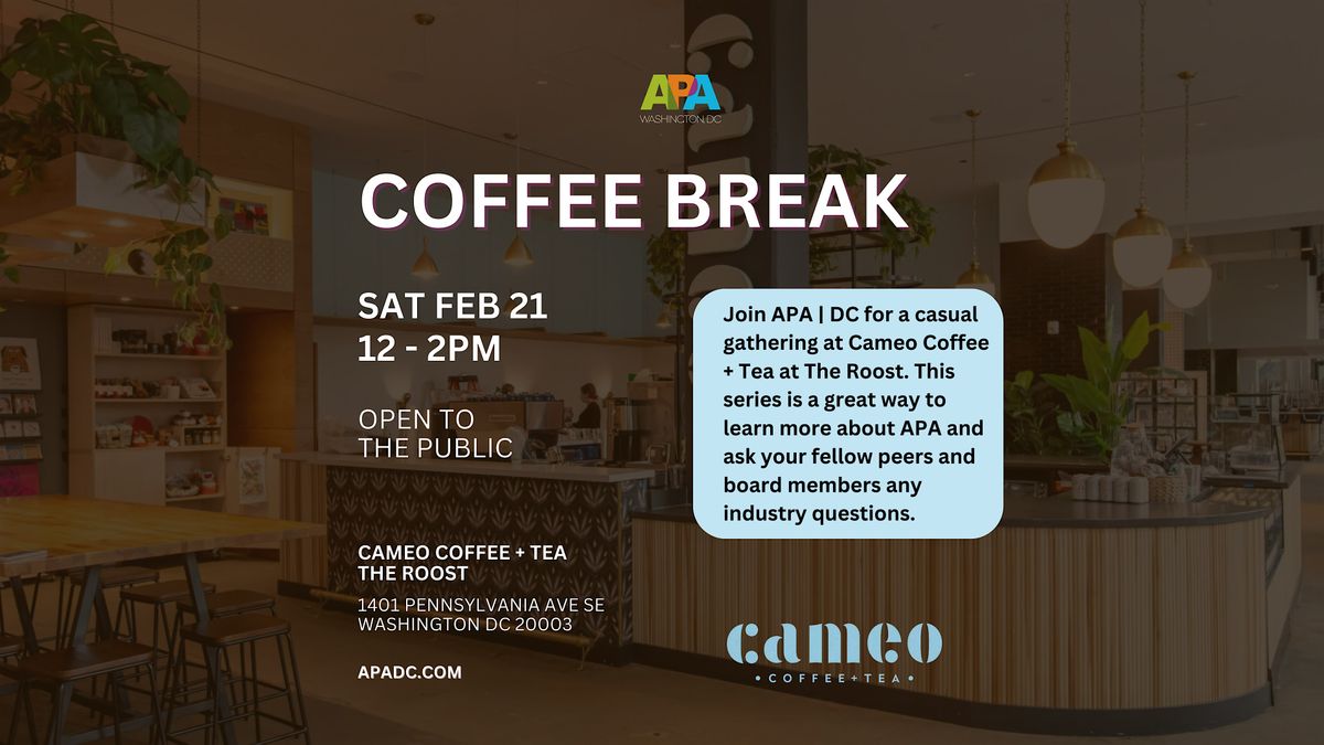 Join APA | DC for a casual gathering this month at Cameo Coffee + Tea at The Roost on Saturday, February 21st from 12pm-2pm. This on-going series is a great way to learn more about APA and ask your fellow peers and board members any industry questions you may have.