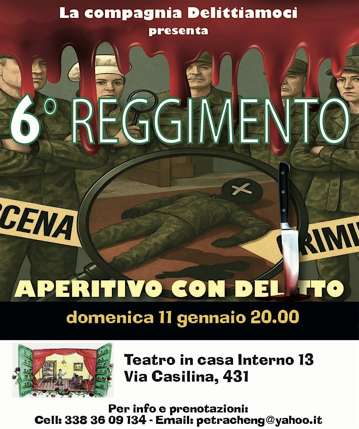 Domenica 11 gennaio alle 20 nel Teatro in casa – Interno 13 (via Casilina 431 – zona Casilina – Torpignattara) ci sarà un aperitivo con delitto e con Piera Fumarola e Aldo Gordiani “6° Reggimento”.