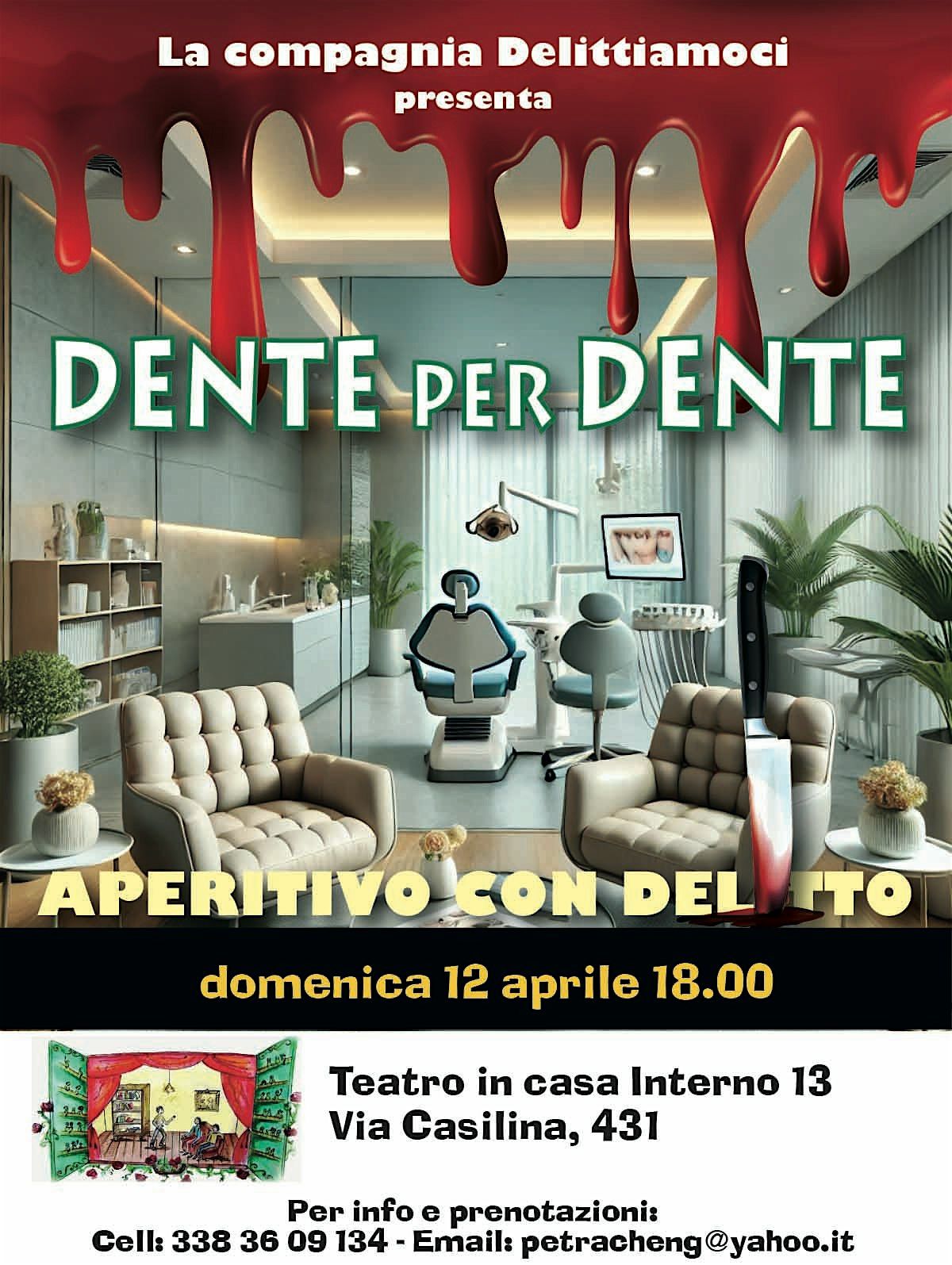 Domenica 12 aprile alle 18 nel Teatro in casa – Interno 13 (via Casilina 431 – zona Casilina – Torpignattara) ci sarà l’aperitivo con delitto di e con Piera Fumarola e Aldo Gordiani “Dente per dente”.