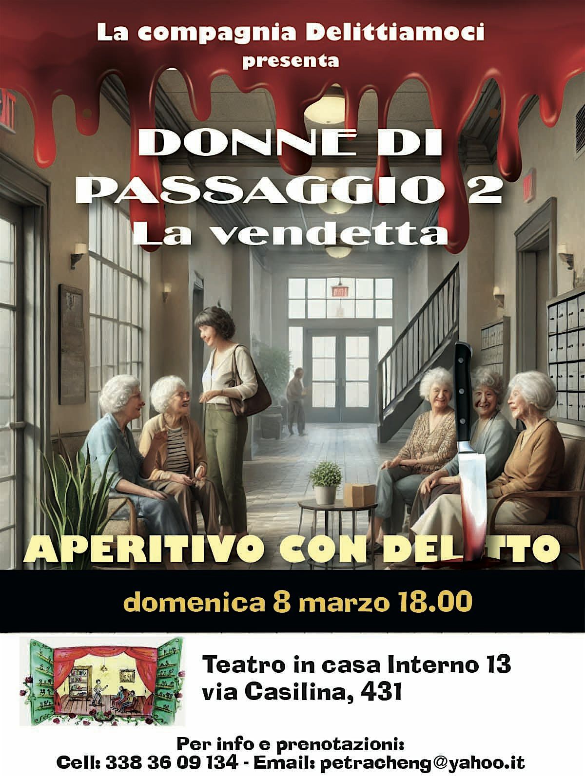 Domenica 8 marzo alle 18.00 nel Teatro in casa – Interno 13 (via Casilina 431 – zona Casilina – Torpignattara) ci sarà uno l’aperitivo con delitto di e con Piera Fumarola e Aldo Gordiani “Donne di passaggio”.