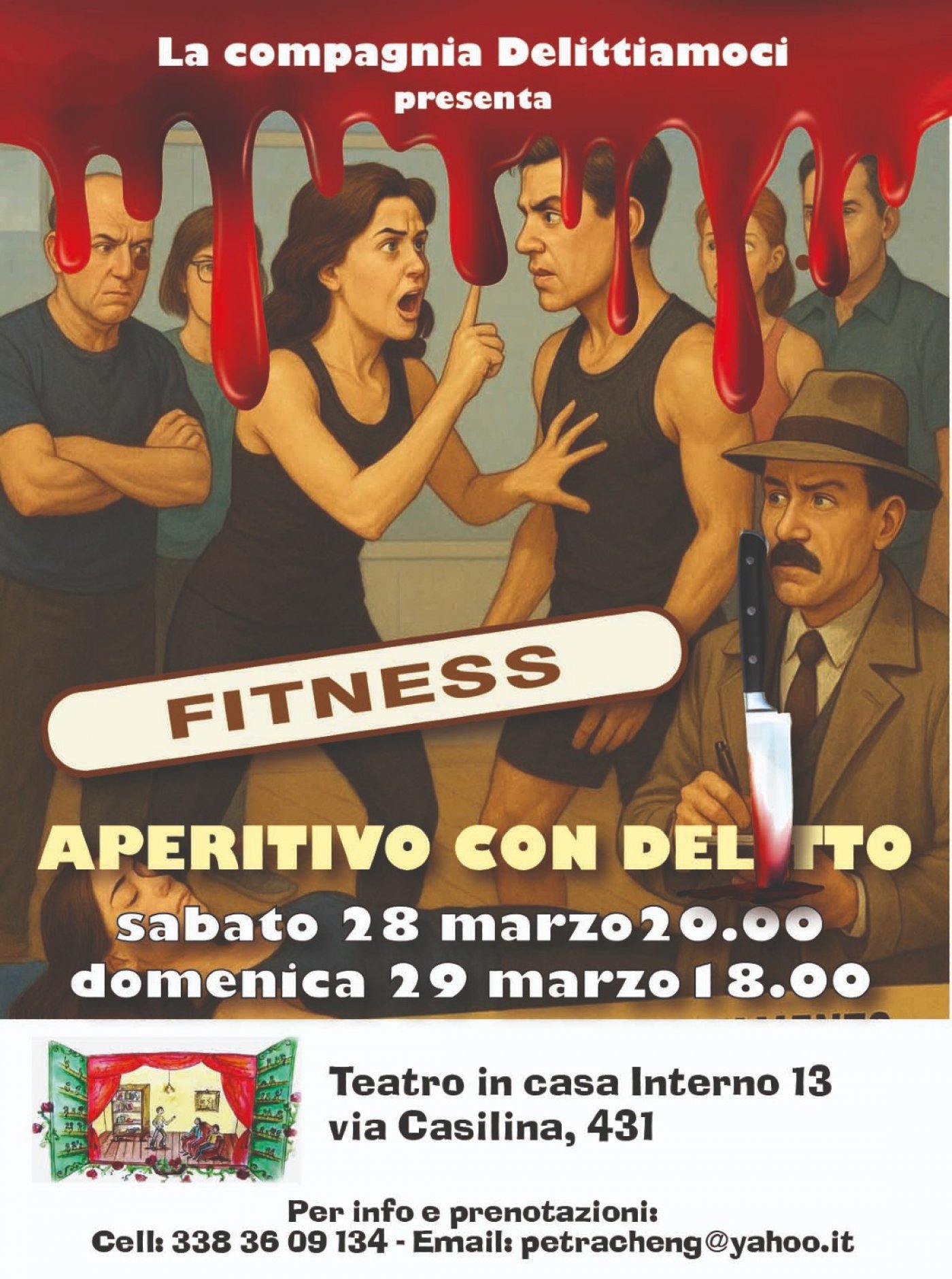 Sabato 28 marzo alle 20 e Domenica 29 marzo alle 18 nel Teatro in casa – Interno 13 (via Casilina 431 – zona Casilina – Torpignattara) ci sarà l’aperitivo con delitto di e con Piera Fumarola e Aldo Gordiani “Fitness, l’ultima lezione”.
