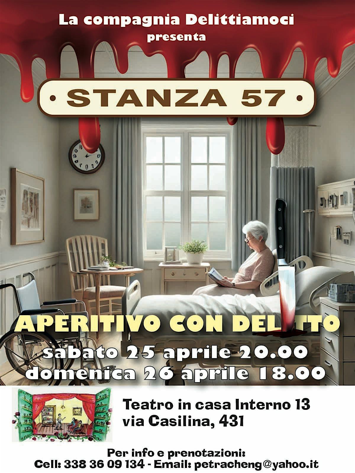 Sabato 25 aprile alle 20 e domenica 26 aprile alle 18 nel Teatro in casa – Interno 13 (via Casilina 431 – zona Casilina – Torpignattara) ci sarà uno l’aperitivo con delitto di e con Piera Fumarola e Aldo Gordiani “Stanza 57”.