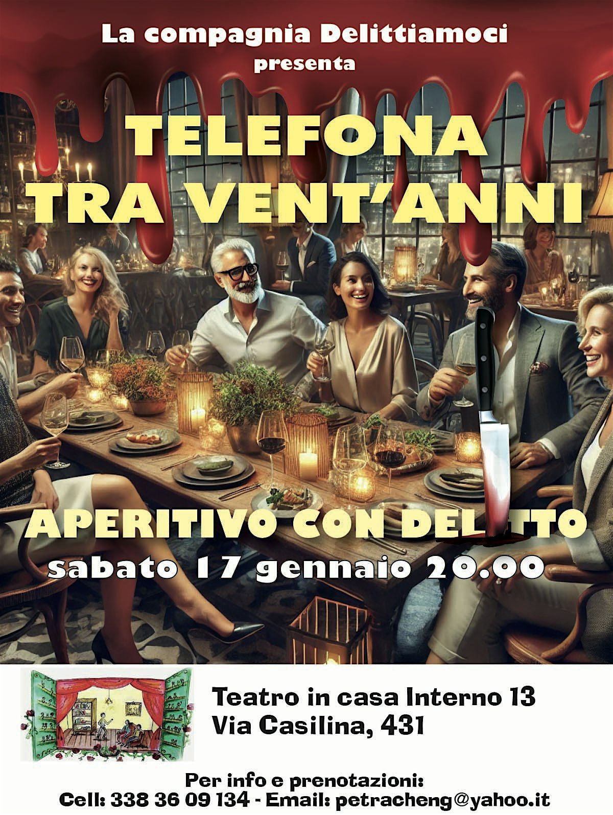 Sabato 17 gennaio alle 20.00 nel Teatro in casa – Interno 13 (via Casilina 431 – zona Casilina – Torpignattara) ci sarà uno l’aperitivo con delitto di e con Piera Fumarola e Aldo Gordiani “"Telefona tra 20 anni".