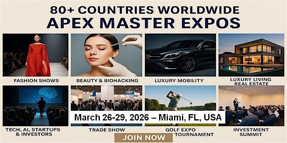 The Apex Masters Expo is a global luxury & business showcase touring over 80 countries 2026. Each multi-day event combines executive networking, luxury experiences, and eight parallel boutique expos – all accessible with a single Apex Multipass.