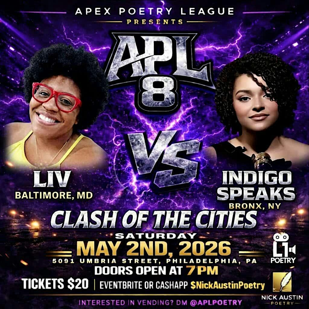 APL 8: Clash of the Cities brings you an unforgettable spoken word experience featuring a curated poetry showcase, a limited open mic for emerging voices, and a high-stakes main event you won’t want to miss. Representing Baltimore, Liv steps into the ring against Indigo Speaks, repping the Bronx, in a 3-round head-to-head showdown of lyricism, presence, and power. Food will be available for purchase and there's plenty of free street parking.