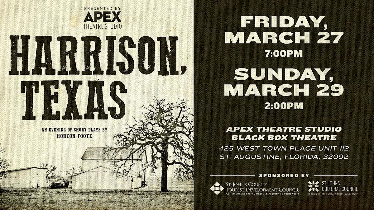 Join us for an evening of short plays by Horton Foote at the Apex Theatre Studio-Black Box Theatre. Experience heartfelt stories and intimate performances that bring small-town Texas to life.