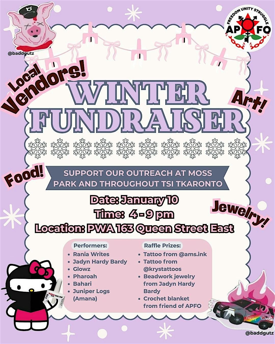 Join us for a night of performances, vendors, art making, raffles, and delicious food! APFO is hosting a winter fundraiser with our friends in community to support our outreach initiatives through the winter. Winter in Tsi Tkaronto (Toronto) when you’re living on the streets is a constant effort of survival and resources are never enough when the city is not building the infrastructure to care for 16 000 + houseless people. Sleeping bags and warming items become life saving supplies.