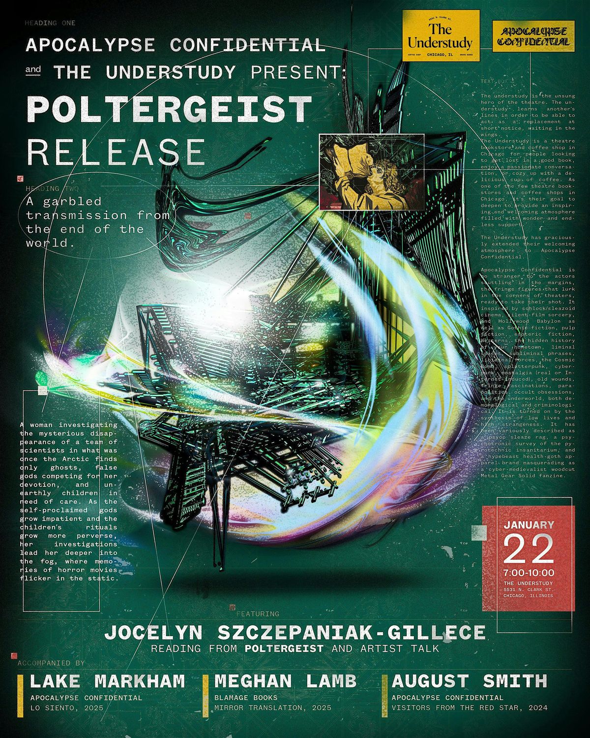 Apocalypse Confidential celebrates the release of Poltergeist by Jocelyn Szczepaniak-Gillece, presented by The Understudy. Featuring readings from Lake Markham, August Smith, and Meghan Lamb. Followed by an author talk.
