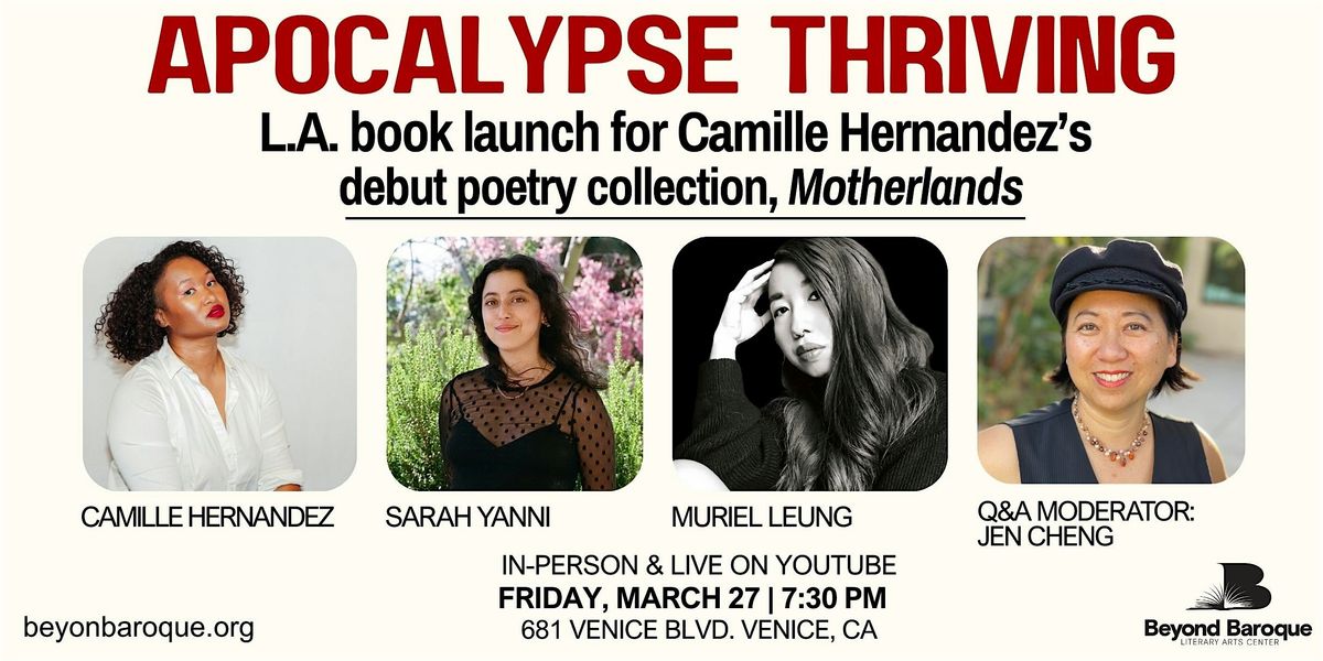 Following a reading from Motherlands, the evening will feature a discussion entitled "Apocalypse Thriving" with a panel of women of color poets who will discuss their perspectives of the end of the world as the beginning of connection; featuring Sarah Yanni, Muriel Leung, and Camille Hernandez, moderated by West Hollywood poet laureate, Jen Cheng. This is an evening that amplifies survival, intuition, and defiant pleasure. Books will be available for purchase. A signing with the authors will follow the discussion.