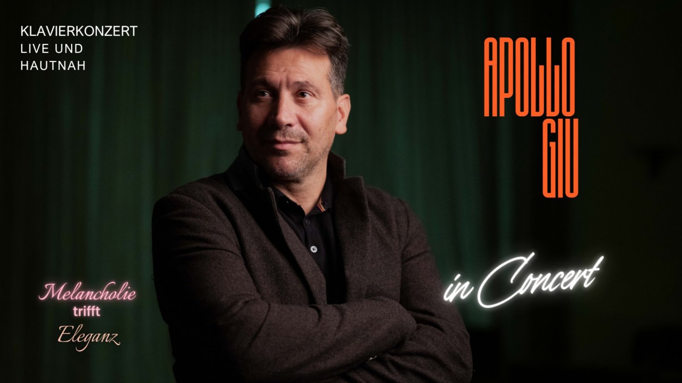 Der italienische Komponist und Pianist Apollo Giu entführt sein Publikum mit berührender Musik – voller Leidenschaft, Tiefe und feiner Eleganz. Lassen Sie sich darauf ein und tauchen Sie ein in einen Raum aus klangvoller Stille. Mit seinen ausdrucksstarken Kompositionen schafft Apollo Giu ein Musikerlebnis der besonderen Art.