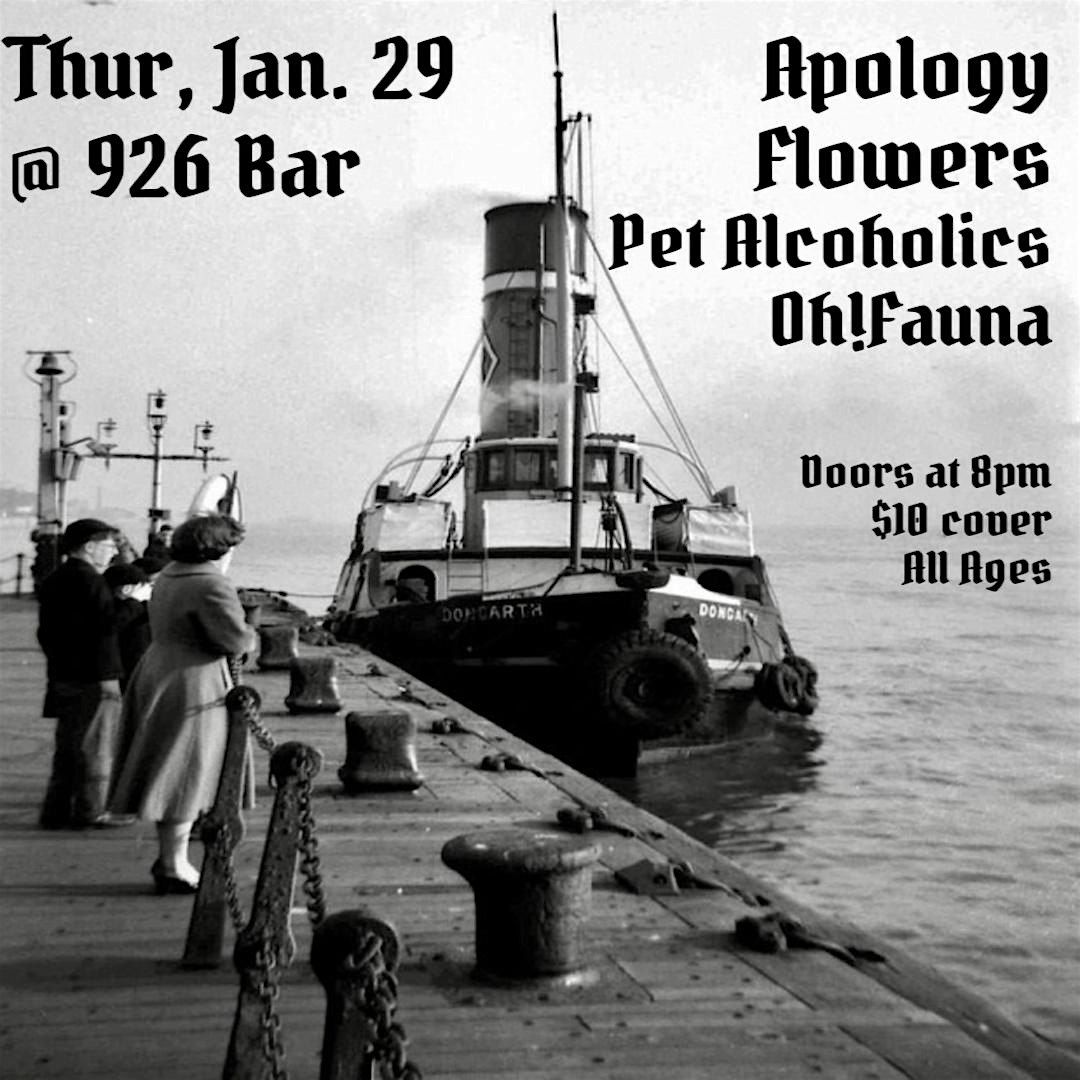 A local band showcase featuring APOLOGY FLOWERS, PET ALCOHOLICS, and OH!FAUNA!