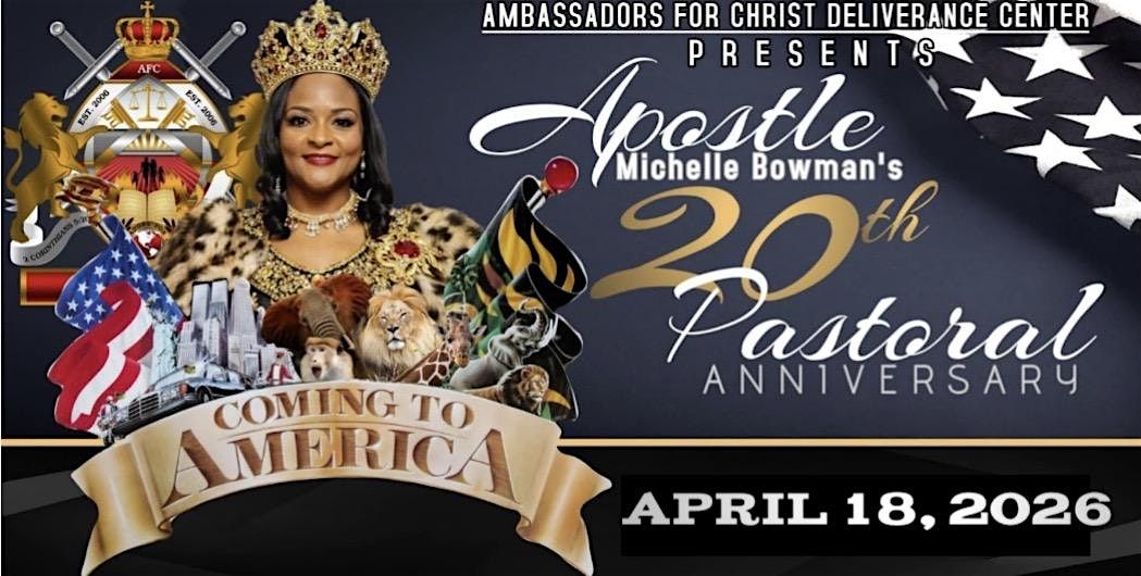 Celebrate with us in person for an unforgettable night as we celebrate Apostle Michelle Bowman’s amazing 20 years in ministry with a hilarious Comedy Roast! Expect laughter, love, and lots of fun as friends and family come together to honor her incredible journey. Don’t miss this special chance to share laughs and memories. Theme: Coming to America.
