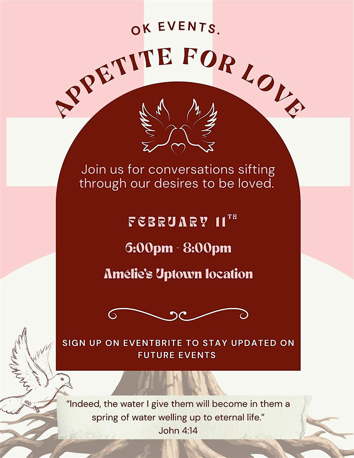This evening offers a curated conversational experience designed to thoughtfully walk through our desire to be loved—using the Bible and the guidance of the Holy Spirit as our foundation. Together, we will explore where our longings come from, how God speaks into them, and what it looks like to surrender those desires for deeper clarity and understanding.
