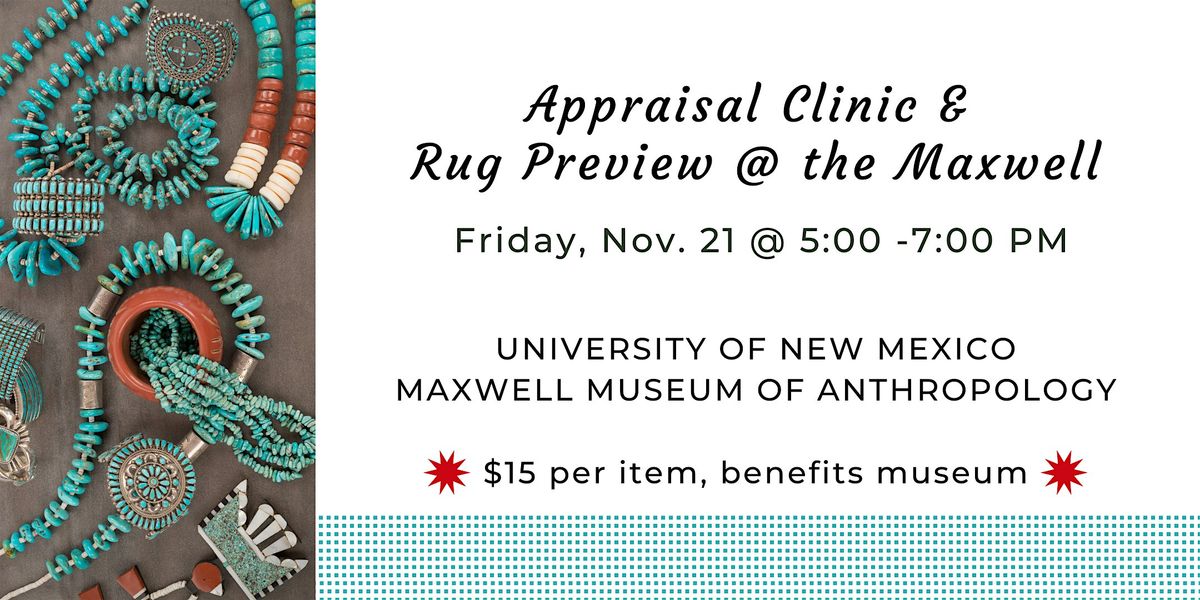 Join us for our annual auction preview, appraisal clinic, and jewelry sale, one day before our 16th Annual Navajo Rug Auction. Both events are run by R.B. Burnham & Company, experts who can help you learn the value of your native art. The $15 per item fee (cash or check, only) for an appraisal directly benefits the Maxwell.
