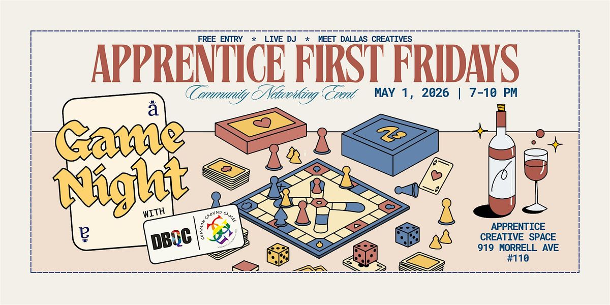 First Fridays is a free networking event for Dallas creatives hosted by Apprentice Creative Space. We are a community 501(c)(3) nonprofit dedicated to promoting literacy and being a hub for creatives looking for an accessible workspace to bring their visions to life! Learn more and donate to support our mission at apprenticeoakcliff.org đź”—