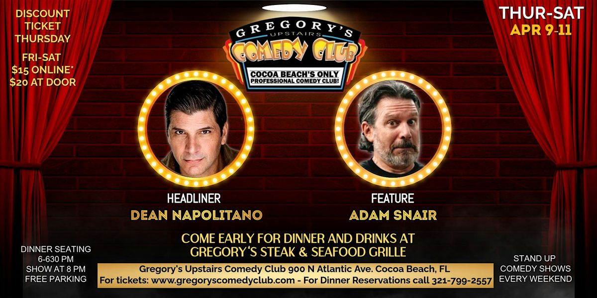 Come see the best touring comedians from all over the country performing every weekend at Gregory's Comedy Club. Enjoy upscale dining with the best local staff Cocoa Beach has to offer! Seating starts 2 hours prior to showtimes. This week nationally touring comedian Dean Napolitano (HBO, NBC) headlines his classic style has been a hit with audiences all over the country! With Central Florida favorite Adam Snair featuring!