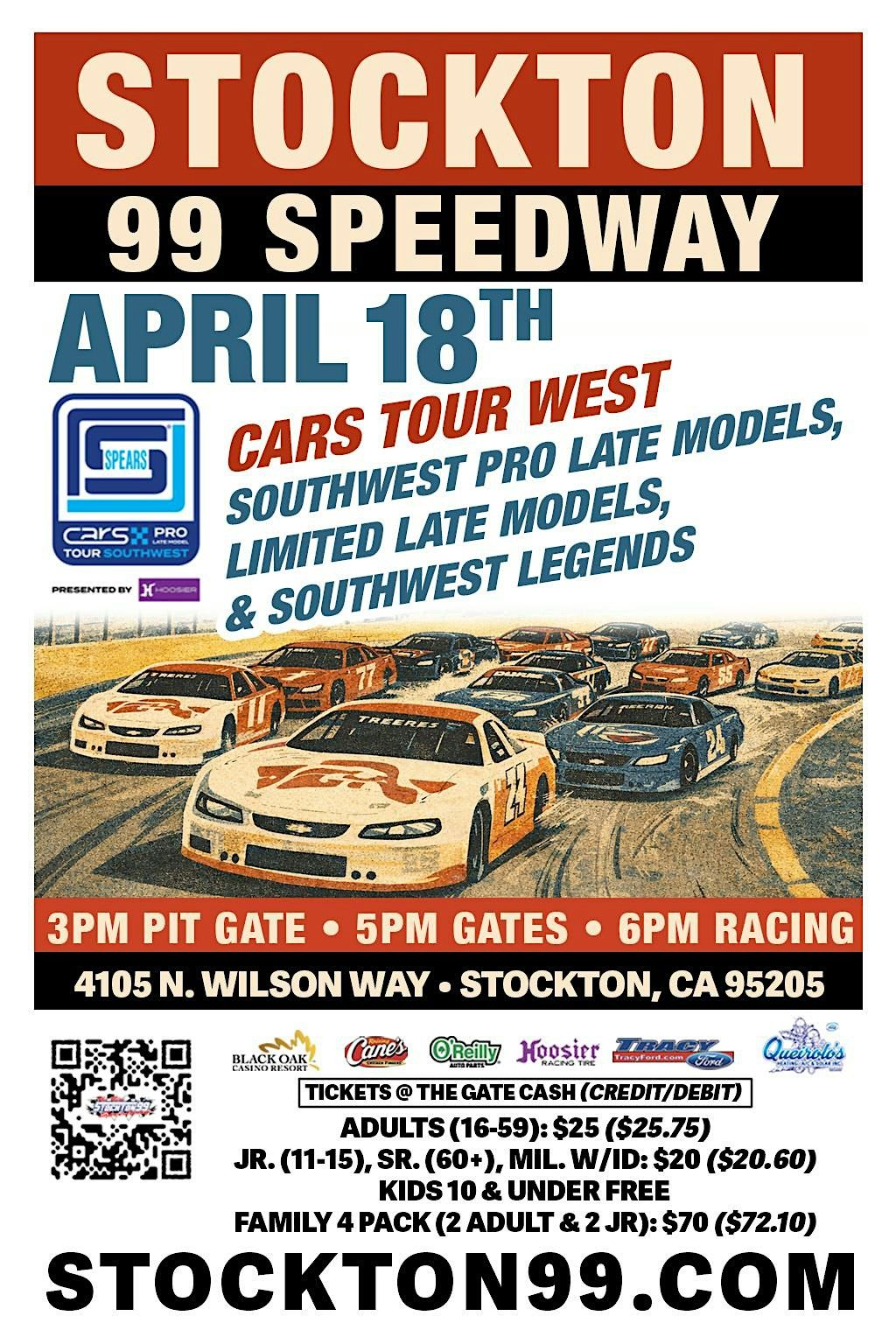 Engines ignite and the stakes go sky-high on April 18th as CARS TOUR WEST storms into Stockton 99 Speedway for a night of pure short-track intensity. The Southwest Pro Late Models headline the show, joined by the hard-charging Limited Late Models and the always thrilling Southwest Legends—three divisions, one unforgettable battle under the lights.