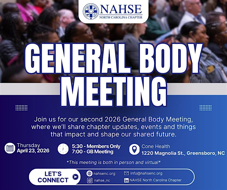 Come and connect with NAHSE NC during our April 2026 General Body Meeting, where we'll share chapter updates, events and things that impact and shape our shared future.