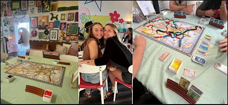 Catan, Ticket to Ride, Hues & Clues, Bananagrams, 7 Wonders & more. The group decides each night!