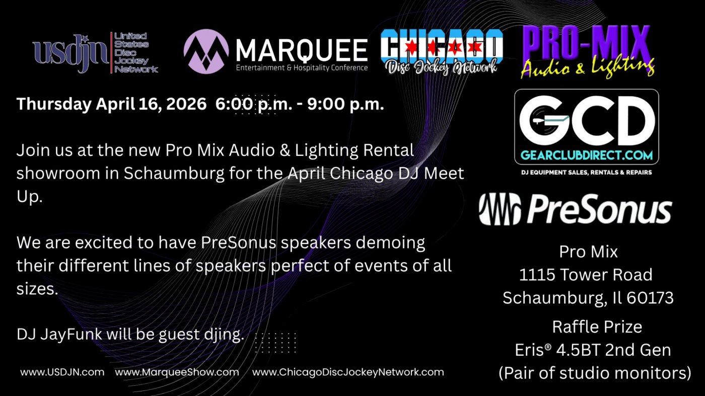 Join us for another awesome Chicago Disc Jockey Meet Up featuring a demo from PreSonus speakers.