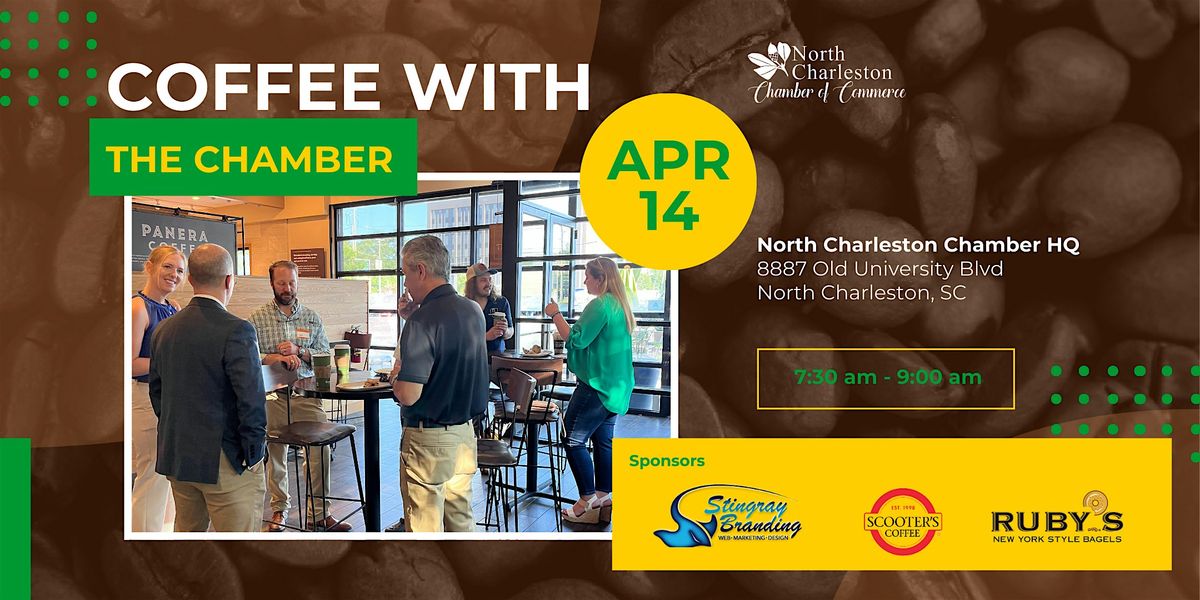 ✨ Start your morning by connecting with fellow professionals in our community! Join us for Coffee with the Chamber on Tuesday, April 14, 2026, from 7:30 AM to 9:00 AM at the North Charleston Chamber HQ. Enjoy coffee and bagels in the lobby while building meaningful connections with local business leaders. ☕️
