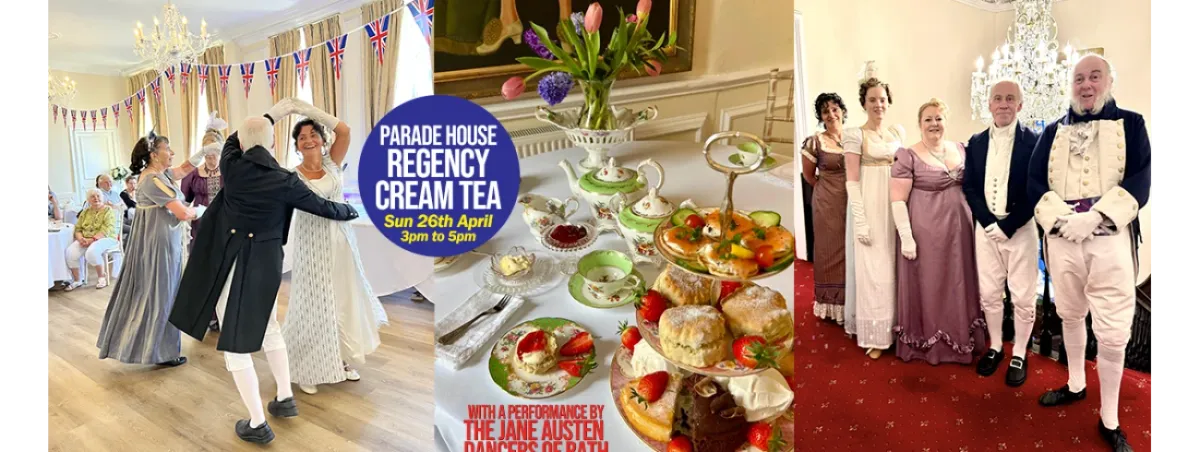 April Cream Tea with the Jane Austen Dancers of Bath. We're delighted to announce the return for 2026 of our signature Regency Cream Teas with the Jane Austen Dancers of Bath. Scrumptious all-butter scones with clotted cream & strawberry jam, wickedly tasty cakes, savoury sandwiches and a choice of fine tea or coffee, all served on elegant vintage china in the beautiful surroundings of Grade 1 listed Parade House. And, for an additional treat, why not start your afternoon with a delicious glass of prosecco or a gin & tonic?Feast yourself and then watch an enchanting performance of Regency dancing by the Jane Austen Dancers of Bath. Guests are invited to get up and join the fun for the final dance. WHAT A WONDERFUL WAY TO SPEND AN AFTERNOON!Please inform us if any member of your party has any dietary restrictions we need to know about. We can accommodate gluten-free provided we receive advance notice, but there is a small additional charge for a fully vegan "not-cream" tea.