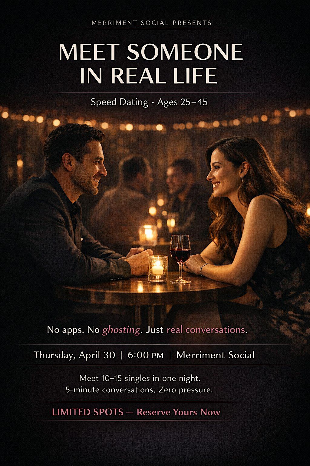 Ready to mix, mingle, and meet new people? Join our April Fun Speed Dating event designed for ages 25-45. It’s a great chance to connect face-to-face in a relaxed, in-person setting. Whether you're looking for a spark or just want to have some fun, this event is all about good vibes and great conversations. Don’t miss out on an evening full of laughs, connections, and maybe even a little romance!