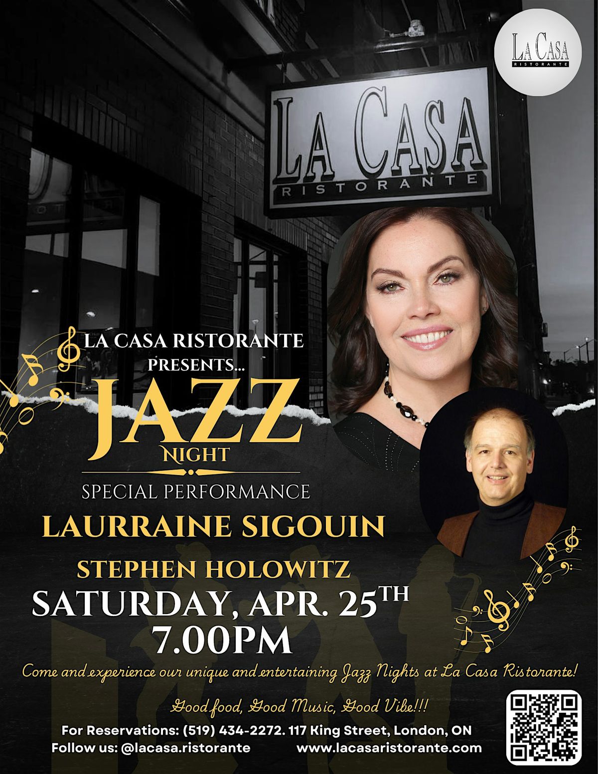 Join us at La Casa Ristorante for a special edition of our signature Jazz Night, featuring the incredible talents of Laurraine Sigouin and Stephen Holowitz.