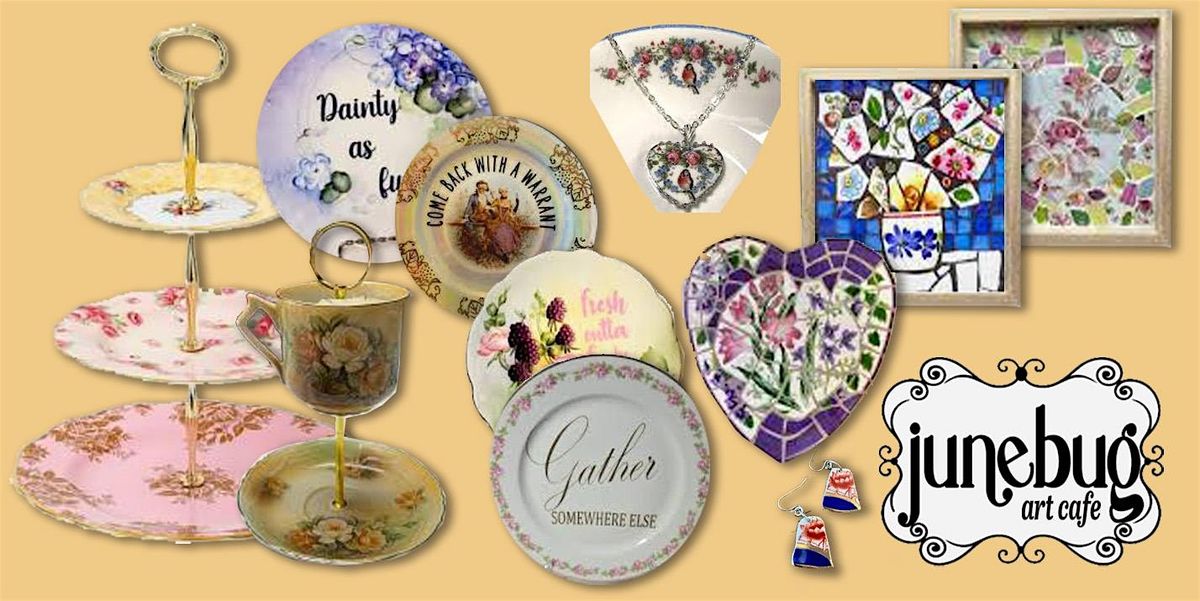 April Junebug - Plates! Snarky, Jewelry, Upcycling & Mosiacs!
