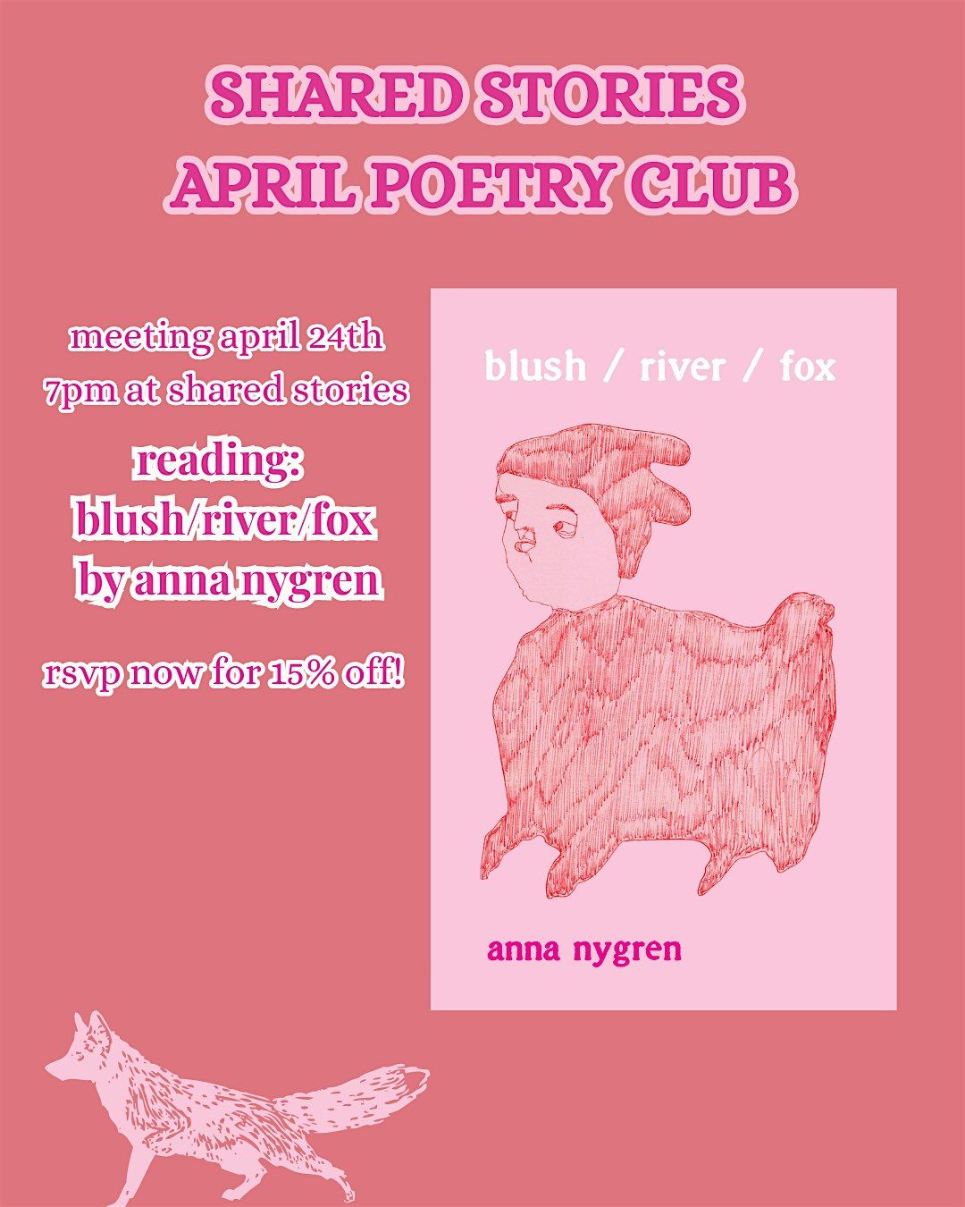 Poetry fans, poets, and pink book enjoyers - in April our Poetry Book Club is reading BLUSH / RIVER / FOX by Anna Nygren! We are meeting April 24th at 7pm at the bookstore! Grab a copy at a discount, bring a friend, and come chat poetry in all its forms with a crowd of lovely readers!