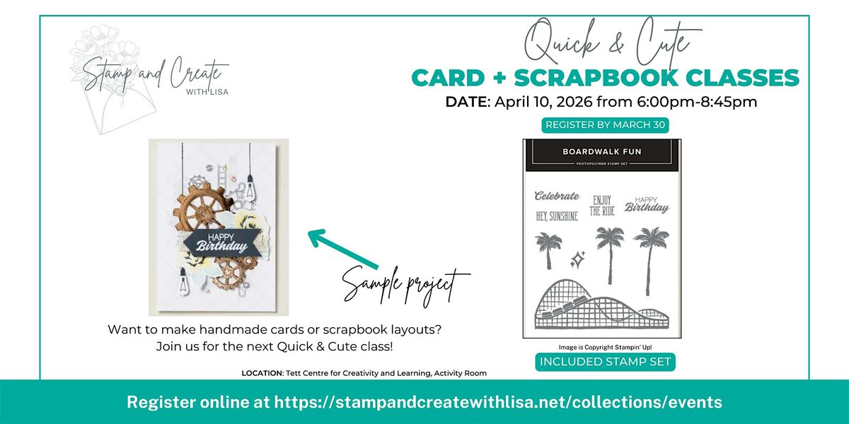 Want to make handmade greeting cards or scrapbook layouts? Come join me for the next Quick & Cute Classes at Tett Creativity Centre in Kingston on Friday, April 10, 2026, from 6:00-8:45pm. Class will be held in the Activity Room #108.