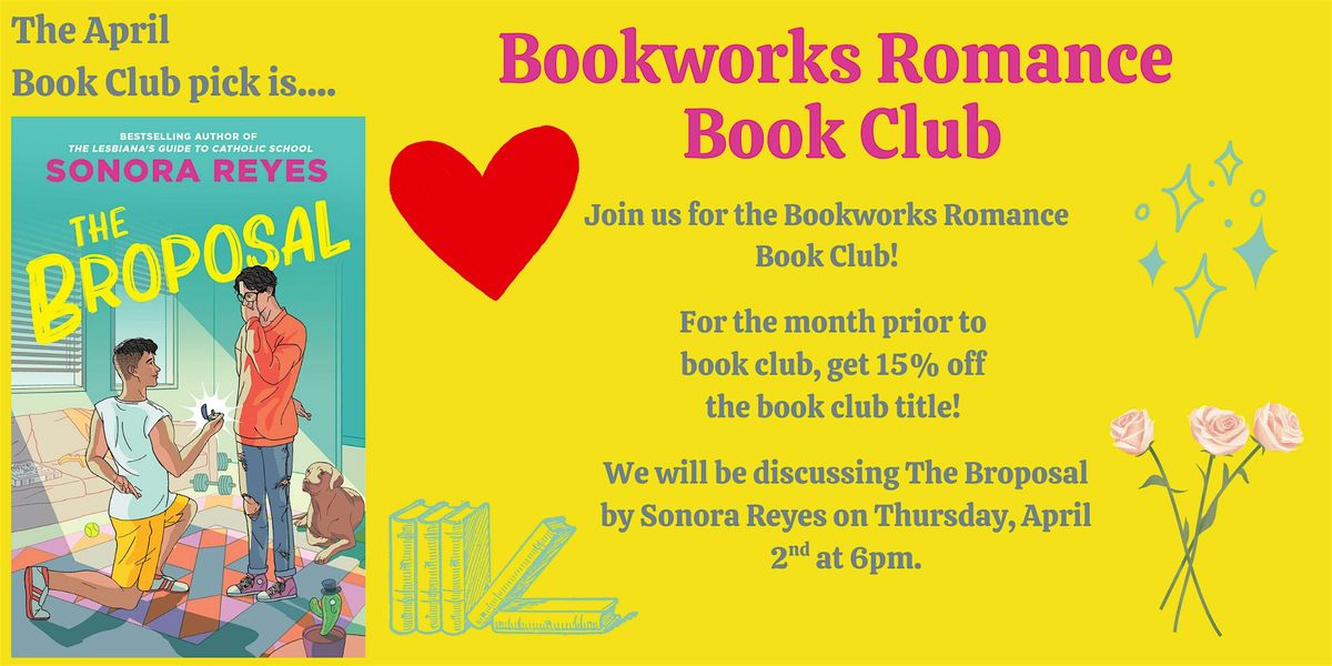 Fan of all things romance and chatting about your favorite books with other readers? Join the new Bookworks Romance Book Club! For the April Romance Book Club, we're reading The Broposal by Sonora Reyes.