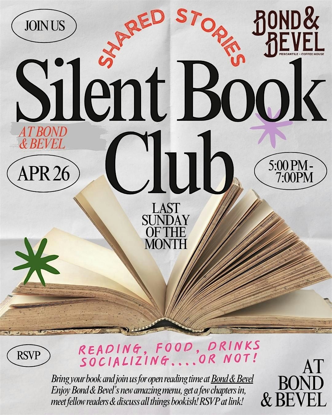 We’re switching it up & are meeting at Bond & Bevel welcoming the new owner to the neighborhood! Come enjoy Bond & Bevel's new menu, hopefully some wine options for everyone & the lovely space and get some reading done!
