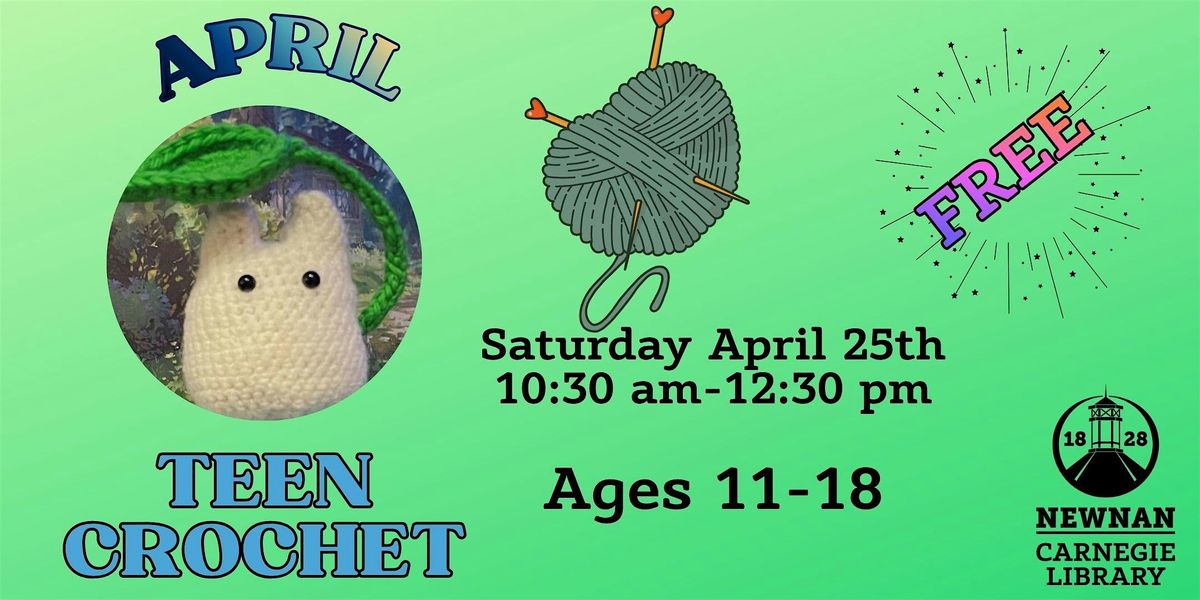 A crochet group just for teens 11-18. All skill levels from beginner to expert welcome! Bring a size H crochet hook and a skein of red heart yarn, or any project you are currently working on and there will be an instructor on hand! There will also be a project of the week with a pattern suitable for most skill levels!