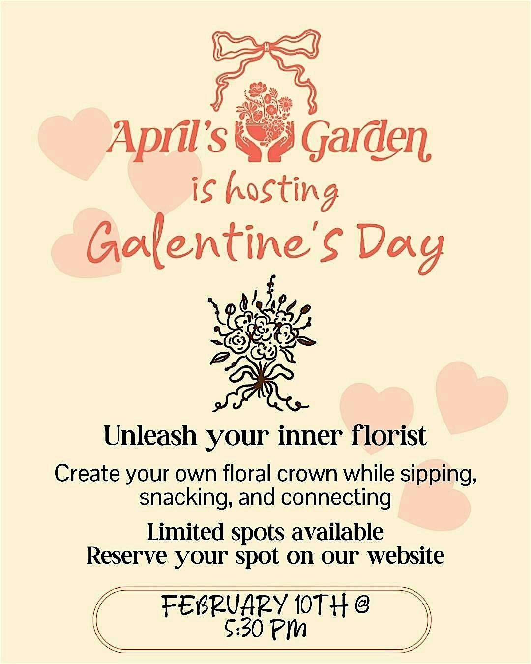 Join us at April’s Garden for a Galentine’s Day evening of floral crown making, sipping, snacking, and connecting. This hands-on workshop is the perfect excuse to gather with your gals, get creative, and take home something beautiful you made yourself.