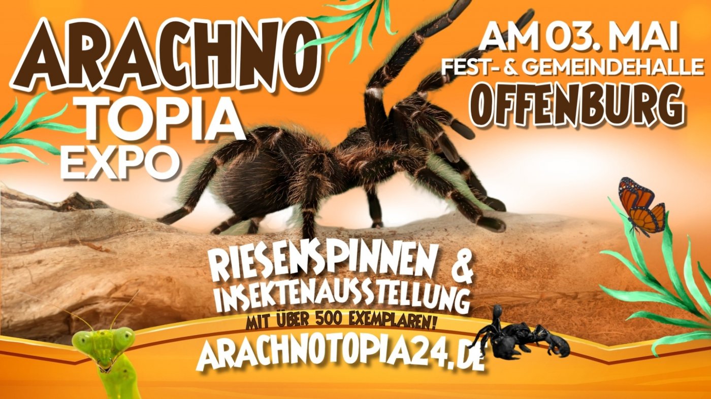 Am 03. Mai 2026 gastiert die außergewöhnliche Spinnen- und Insektenausstellung in der Fest- & Gemeindehalle Offenburg-Weier. Besucherinnen und Besucher erhalten die Gelegenheit, die faszinierende und oftmals unbekannte Welt der Wirbellosen aus nächster Nähe zu entdecken.