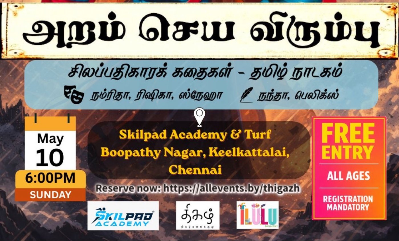 Aram Seya Virumbu is a 60-minute Tamil play inspired by selected stories from Ilango Adigal’s epic Silapadhikaram. The core intent of the play is to explore the many shades of Aram (righteousness), and to reflect on how these values remain deeply relevant in our lives today.